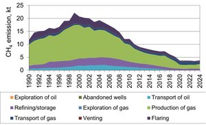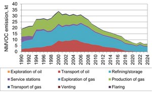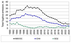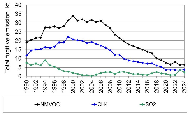 In 2024 fugitive emissions from oil account for 72 % of the sectoral NMVOC emission and 17 % of the sectoral CH4 emission. Fugitive emissions from refineries account for 58 % of the NMVOC emission and 13 % of the CH4 emission. The two major fugitive sources of fugitive SO2; refineries and flaring contributing 89 % and 11 % in 2024.