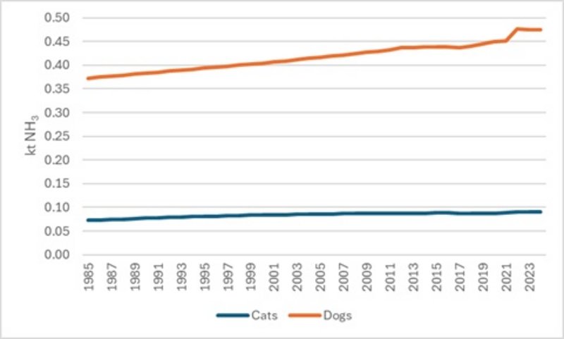 In the reporting sector Other Denmark reports emissions of NH3 from dogs and cats. Emissions are reported for the years 1985-2024 and in 2024 the emission of NH3 contribute with 0.8 % of the Danish emission of NH3. In Figure 1 the trend for the emissions is shown. Emission from both dogs and cats has increased from 1985-2024 due to an increase in the number of animals.