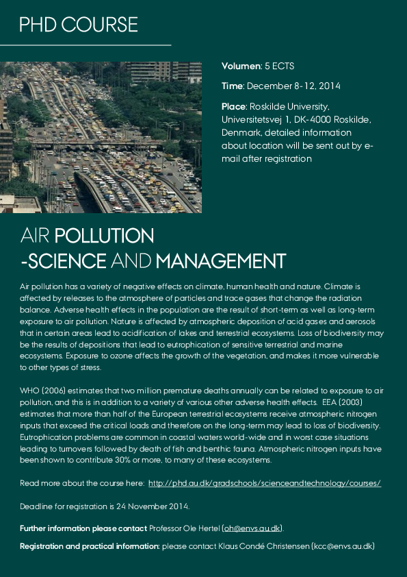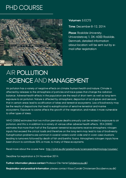 PhD course, AIR POLLUTION – SCIENCE AND MANAGEMENT 5 ECTS course taking place December 8-12, 2014. Oplysninger om arrangementet Tidspunkt mandag 8. december 2014, kl. 10:00 - fredag 12. december 2014, kl. 16:00 Tilføj til kalender Sted Department for Environmental, Social and Spatial Change (ENSPAC) at Roskilde University, Universitetsvej 1, DK-4000 Roskilde, Denmark Arrangør Department of Environmental Science, Aarhus University Af Winni Eia Esbensen Find course description and registration information here.