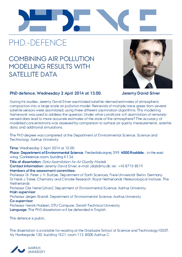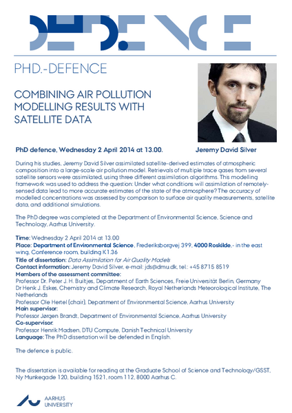 During his studies, Jeremy David Silver assimilated satellite-derived estimates of atmospheric composition into a large-scale air pollution model. Retrievals of multiple trace gases from several satellite sensors were assimilated, using three different assimilation algorithms. This modelling framework was used to address the question: Under what conditions will assimilation of remotely-sensed data lead to more accurate estimates of the state of the atmosphere? The accuracy of modelled concentrations was assessed by comparison to surface air quality measurements, satellite data, and additional simulations.